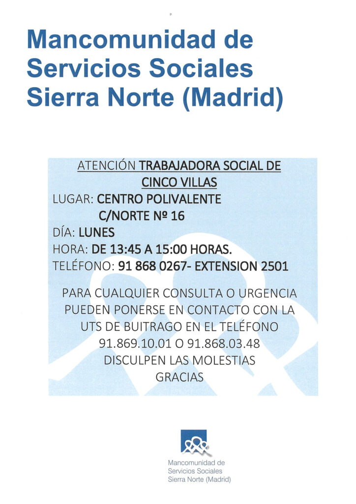 Mancomunidad de Servicios Sociales de Sierra Norte (Madrid) Informa. 12/12/2022Navegación entre publicacionesAnteriorPublicación anterior:Actividades navideñas en Puentes ViejasSiguientePublicación siguiente:Gestión eficiente de residuos de autónomos y microempresasNoticias relacionadasAviso de interrupción de suministro eléctrico11/12/2025Actividades Navidad Puentes Viejas10/12/2025Campamento urbano de invierno 202509/12/2025Saborea la Navidad de la Sierra Norte05/12/2025Modificación de los horarios de la línea 196 (Madrid – La Acebeda)04/12/2025Puentes Viejas Cardioprotegida03/12/2025