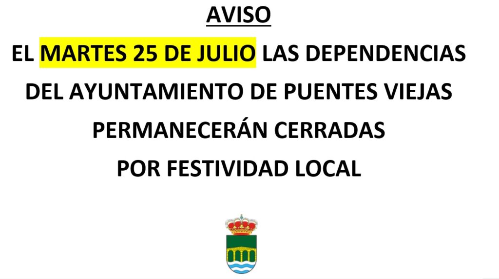 21/07/2023Navegación entre publicacionesAnteriorPublicación anterior:CONCURSO DE DISFRACES MANGIRÓN 2023SiguientePublicación siguiente:BOCM Cuenta General del presupuesto correspondiente al ejercicio económico de 2022Noticias relacionadasAviso de interrupción de suministro eléctrico11/12/2025Actividades Navidad Puentes Viejas10/12/2025Campamento urbano de invierno 202509/12/2025Saborea la Navidad de la Sierra Norte05/12/2025Modificación de los horarios de la línea 196 (Madrid – La Acebeda)04/12/2025Puentes Viejas Cardioprotegida03/12/2025
