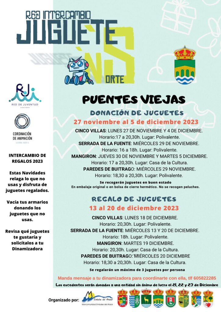 Nuevas formas de Reutilizar. Lo que no usas puede que a alguien le venga bien! ç 01/12/2023Navegación entre publicacionesAnteriorPublicación anterior:Jornadas Divulgativas «Turismo y Patrimonio» SiguientePublicación siguiente:DECORAMOS PUENTES VIEJAS 2023Noticias relacionadasAviso de interrupción de suministro eléctrico11/12/2025Actividades Navidad Puentes Viejas10/12/2025Campamento urbano de invierno 202509/12/2025Saborea la Navidad de la Sierra Norte05/12/2025Modificación de los horarios de la línea 196 (Madrid – La Acebeda)04/12/2025Puentes Viejas Cardioprotegida03/12/2025