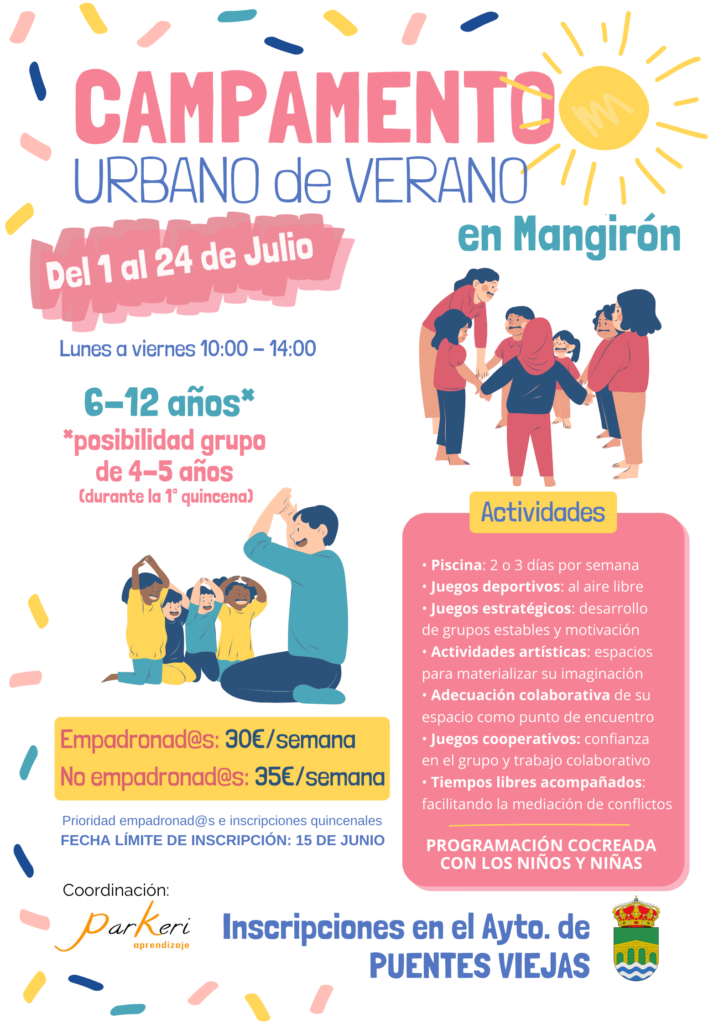 Abiertas las inscripciones para el Campamento Urbano de Verano en Mangirón, dirigido a niños y niñas de 6 a 12 años y organizado dentro del marco del Programa Corresponsables 2024 de la Comunidad de Madrid para facilitar la conciliación familiar.