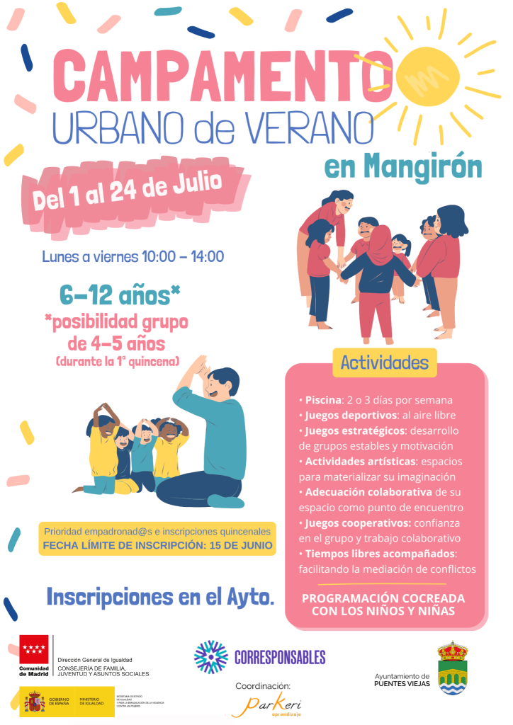 Abiertas las inscripciones para el Campamento Urbano de Verano en Mangirón, dirigido a niños y niñas de 6 a 12 años y organizado dentro del marco del Programa Corresponsables 2024 de la Comunidad de Madrid para facilitar la conciliación familiar.