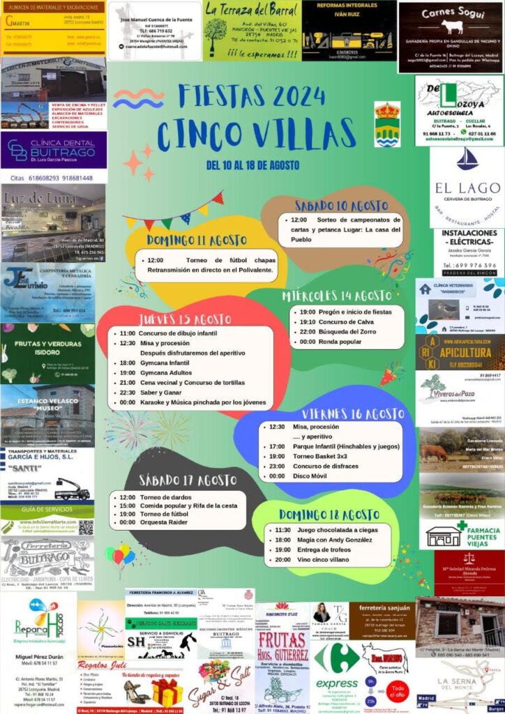 Programación de las fiestas de Cinco Villas 2024 09/08/2024Navegación entre publicacionesAnteriorPublicación anterior:Fiestas Mangirón 2024SiguientePublicación siguiente:SEMANA DEPORTIVANoticias relacionadasAviso de interrupción de suministro eléctrico11/12/2025Actividades Navidad Puentes Viejas10/12/2025Campamento urbano de invierno 202509/12/2025Saborea la Navidad de la Sierra Norte05/12/2025Modificación de los horarios de la línea 196 (Madrid – La Acebeda)04/12/2025Puentes Viejas Cardioprotegida03/12/2025