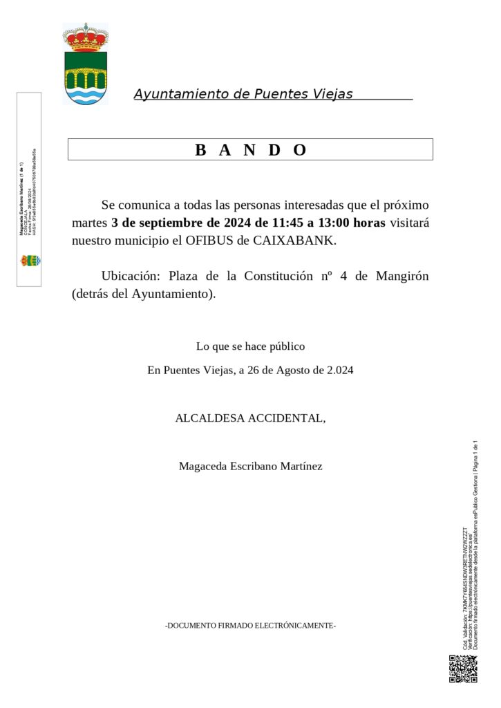 La próxima visita del autobús de CaixaBank a nuestro municipio será el martes 3 de septiembre en horario de 11:45 a 13:00.Se ubicará, como siempre, en la Plaza de la Constitución de Mangirón (detrás del Ayuntamiento). 27/08/2024Navegación entre publicacionesAnteriorPublicación anterior:Bando Bienestar AnimalSiguientePublicación siguiente:Aviso Consultas MédicasNoticias relacionadasAviso de interrupción de suministro eléctrico11/12/2025Actividades Navidad Puentes Viejas10/12/2025Campamento urbano de invierno 202509/12/2025Saborea la Navidad de la Sierra Norte05/12/2025Modificación de los horarios de la línea 196 (Madrid – La Acebeda)04/12/2025Puentes Viejas Cardioprotegida03/12/2025