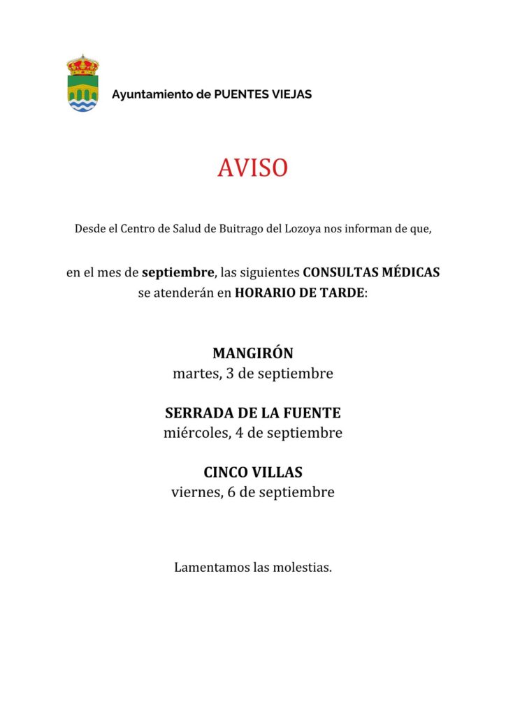 Cambios en el horario de algunas consultas médicas durante la primera semana de septiembre en Mangirón, Serrada y Cinco Villas. 29/08/2024Navegación entre publicacionesAnteriorPublicación anterior:OFIBUS de CAIXABANK septiembre 2024SiguientePublicación siguiente:Evaluación Semana Deportiva 2024Noticias relacionadasAviso de interrupción de suministro eléctrico11/12/2025Actividades Navidad Puentes Viejas10/12/2025Campamento urbano de invierno 202509/12/2025Saborea la Navidad de la Sierra Norte05/12/2025Modificación de los horarios de la línea 196 (Madrid – La Acebeda)04/12/2025Puentes Viejas Cardioprotegida03/12/2025