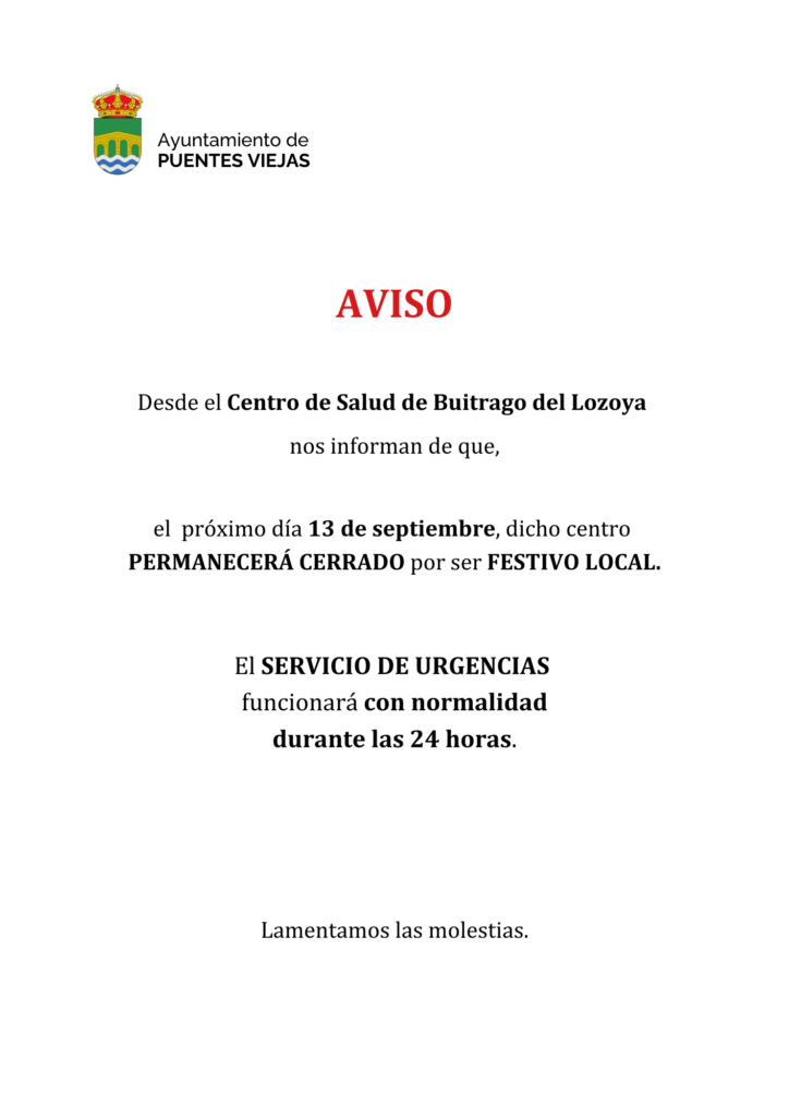 Con motivo de festividad local en Buitrago del Lozoya, el próximo viernes 13 de septiembre, el Centro de Salud de Buitrago permanecerá cerrado.