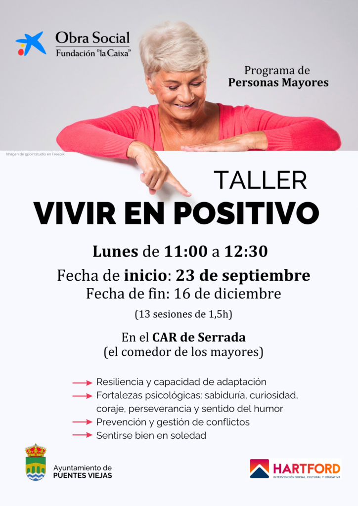 A partir del 23 de septiembre, en el CAR (Centro Abierto Rural) de Serrada, se impartirá el taller «Vivir en positivo«. Una actividad concedida por Fundación «la Caixa» dentro de su Programa de Personas Mayores. 12/09/2024Navegación entre publicacionesAnteriorPublicación anterior:Fiesta de San Miguel en MangirónSiguientePublicación siguiente:Atención al Consumidor en Cinco VillasNoticias relacionadasAviso de interrupción de suministro eléctrico11/12/2025Actividades Navidad Puentes Viejas10/12/2025Campamento urbano de invierno 202509/12/2025Saborea la Navidad de la Sierra Norte05/12/2025Modificación de los horarios de la línea 196 (Madrid – La Acebeda)04/12/2025Puentes Viejas Cardioprotegida03/12/2025