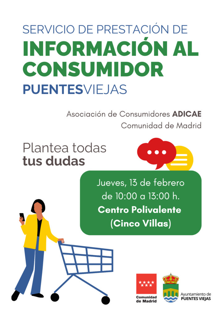 El jueves 13 de febrero visita Puentes Viejas el Servicio de Información al Consumidor. Esta vez, estará en el Centro Polivalente de Cinco Villas, de 10:00 a 13:00. Más información aquí 12/02/2025Navegación entre publicacionesAnteriorPublicación anterior:Ofibus de CaixaBAnkSiguientePublicación siguiente:Madrid Rural LabNoticias relacionadasAviso de interrupción de suministro eléctrico11/12/2025Actividades Navidad Puentes Viejas10/12/2025Campamento urbano de invierno 202509/12/2025Saborea la Navidad de la Sierra Norte05/12/2025Modificación de los horarios de la línea 196 (Madrid – La Acebeda)04/12/2025Puentes Viejas Cardioprotegida03/12/2025