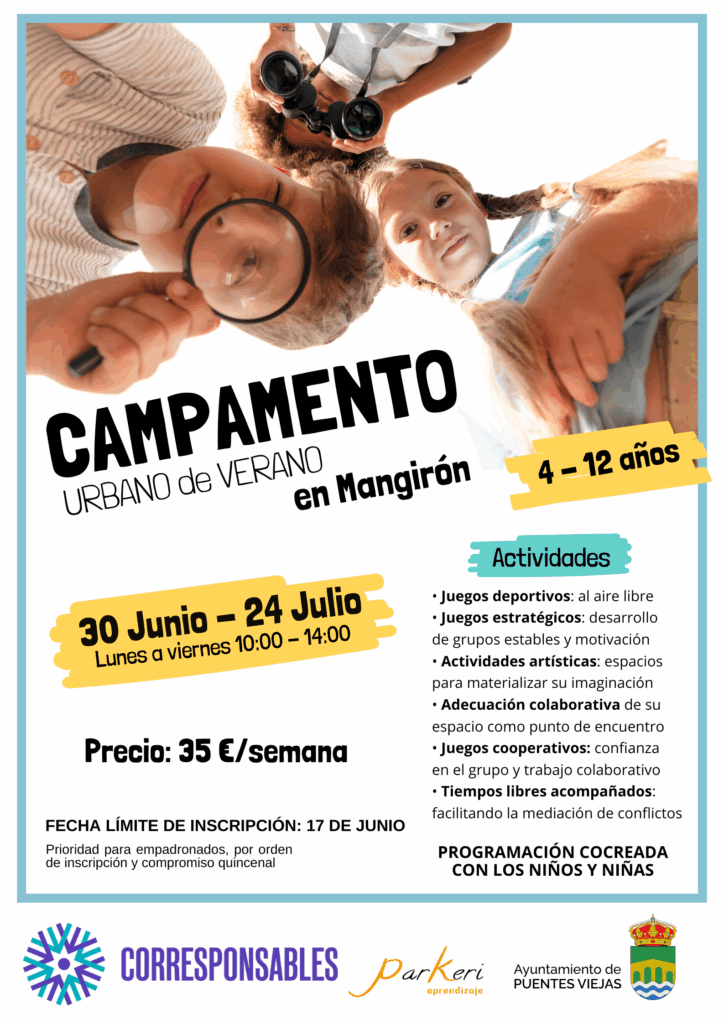 Abiertas las inscripciones para el Campamento Urbano de Verano en Mangirón, dirigido a niños y niñas de 4 a 12 años y organizado dentro del marco del Programa Corresponsables.