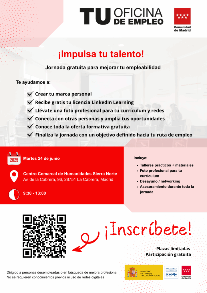 ¿Estás buscando empleo o quieres mejorar tu situación profesional? El próximo martes 24 de junio de 2025, de 9:30 a 13:00, se celebrará una jornada gratuita en el Centro Comarcal de Humanidades Sierra Norte (Av. de la Cabrera, 96, 28751 La Cabrera, Madrid) para ayudarte a impulsar tu carrera.