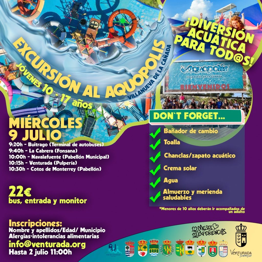 Los municipios de Venturada, Navalafuente, Redueña, Gargantilla de Lozoya, Pinilla de Buitrago, La Cabrera, Puentes Viejas, Montejo, El Vellón, Alameda del Valle y Gascones organizan una excursión al Aquópolis, dirigida a jóvenes de 10 a 17 años.