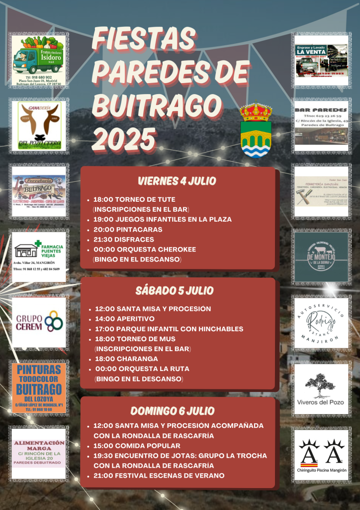 Un año más, os invitamos a disfrutar de las fiestas de Paredes de Buitrago, que se celebrarán los días 4, 5 y 6 de julio de 2025. Un fin de semana lleno de actividades para todas las edades, donde no faltarán la música, los juegos, las tradiciones y la buena compañía.