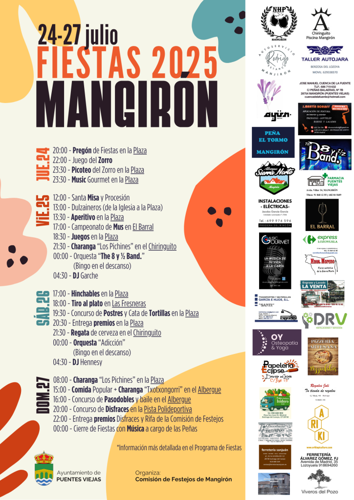 ¡Solo falta una semana para que den comienzo las Fiestas de Mangirón 2025! Del 24 al 27 de julio, nuestro pueblo se llenará de alegría con un programa cargado de actividades para todas las edades: juegos, música, concursos, orquestas y mucho más.