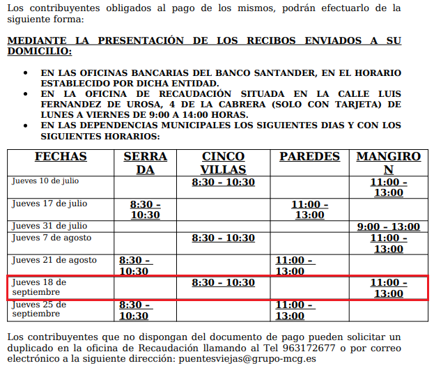 Los horarios serán de 8:30 a 10:30 en la Sala Polivalente de Cinco Villas y de 11:00 a 13:00 en las oficinas del Ayuntamiento en Mangirón.