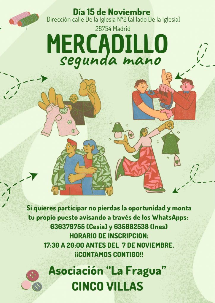 El próximo 15 de noviembre se celebrará en Cinco Villas un Mercadillo de Segunda Mano, una cita abierta a todos los vecinos y vecinas que deseen dar una segunda vida a los objetos que ya no utilizan o encontrar nuevas oportunidades entre los puestos.