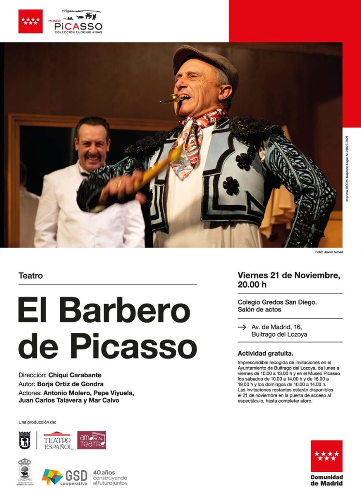 El 21 de noviembre a las 20:00 h, el Colegio Gredos San Diego (Salón de Actos) acogerá la representación de El barbero de Picasso, una comedia basada en la relación real entre Pablo Picasso y su peluquero, Eugenio Arias, un exiliado español en Vallauris. A partir de sus charlas en la barbería surgen discusiones apasionadas —sobre arte, política o toros— que, entre risas, nos invitan a reflexionar sobre nuestro pasado y sobre la dificultad de entendernos para construir juntos.