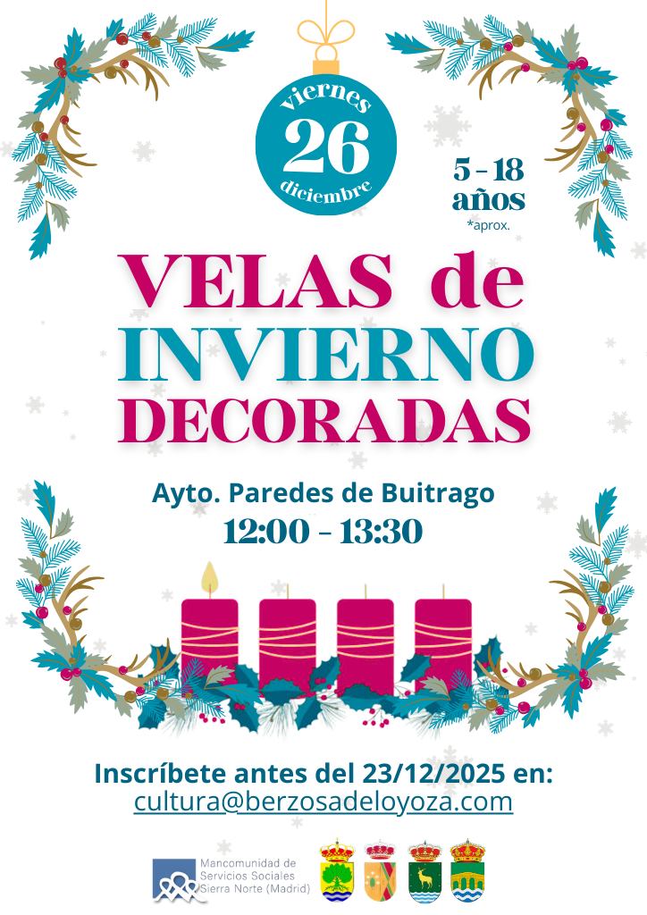 El viernes 26 de diciembre, de 12:00 a 13:30 horas, el Ayuntamiento de Paredes de Buitrago acogerá este taller creativo en el que los participantes podrán diseñar y decorar sus propias velas. Para participar es necesaria inscripción previa antes del 23/12/2025 en el correo: cultura@berzosadeloya.com.
