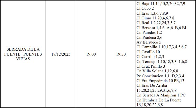 Se informa a los vecinos de Serrada de la Fuente que, debido a trabajos de ampliación y mantenimiento realizados por Iberdrola, se producirá un corte de suministro el próximo jueves 18 de diciembre de 2025, entre las 19:00 y las 19:30 horas, en varias calles del municipio. Rogamos disculpen las molestias.