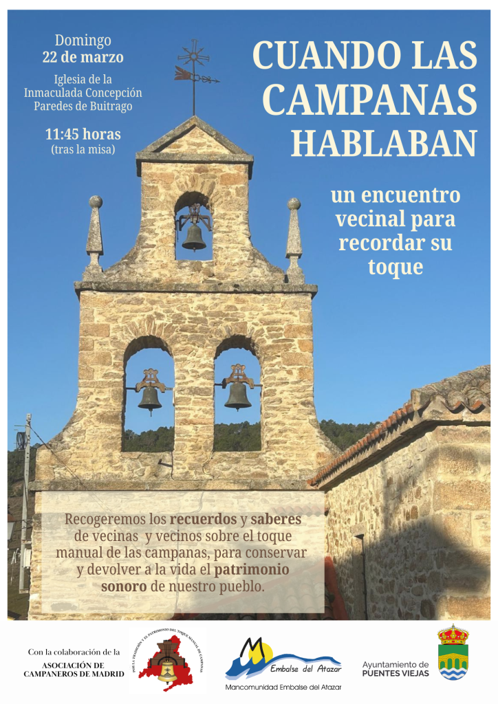 Ahora queremos seguir recogiendo recuerdos, historias y saberes ligados a ese sonido, gracias a la participación del vecindario y al trabajo de los campaneros de la Asociación de Campaneros de Madrid, que también estudiarán y datarán las campanas del municipio.