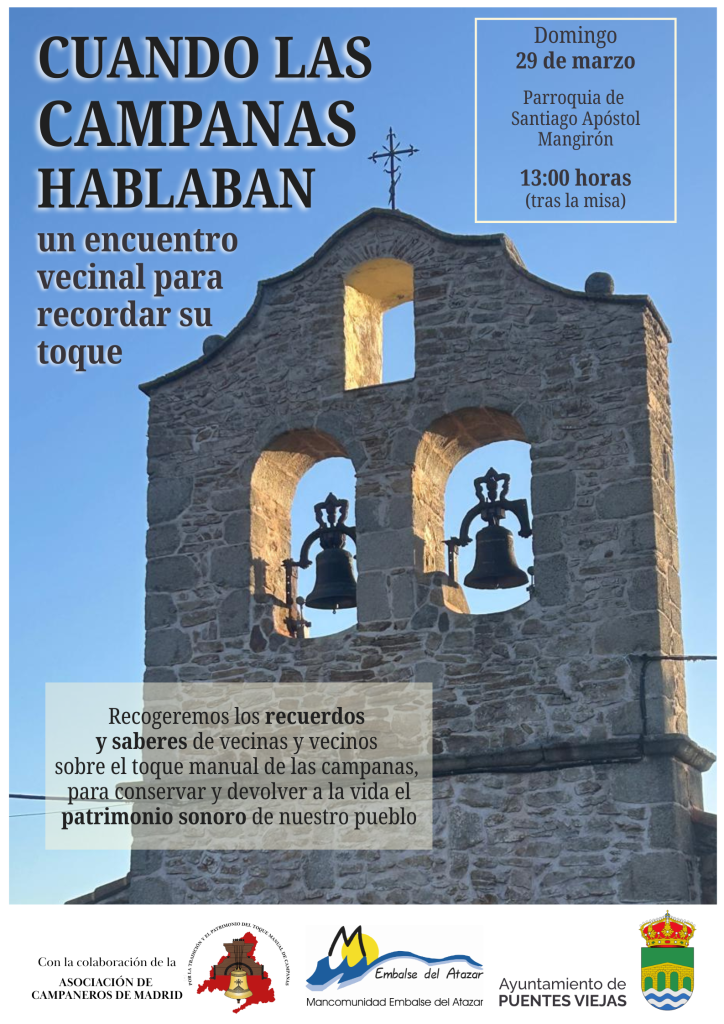 Tras los encuentros en Serrada de la Fuente y Paredes de Buitrago, el proyecto “Cuando las campanas hablaban” llega ahora a Mangirón para seguir recogiendo recuerdos, historias y saberes ligados al sonido de las campanas y a nuestro patrimonio sonoro.