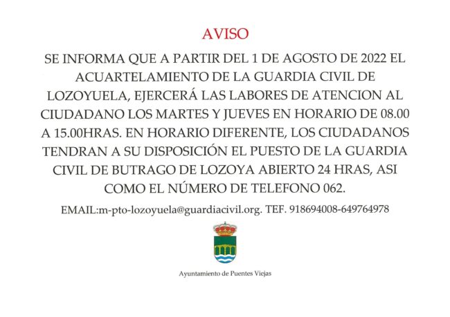 AVISO GUARDIA CIVIL LOZOYUELA UncategorizedPor Puentes Viejas10/08/2022A PARTIR DEL 1 DE AGOSTO DE 2022