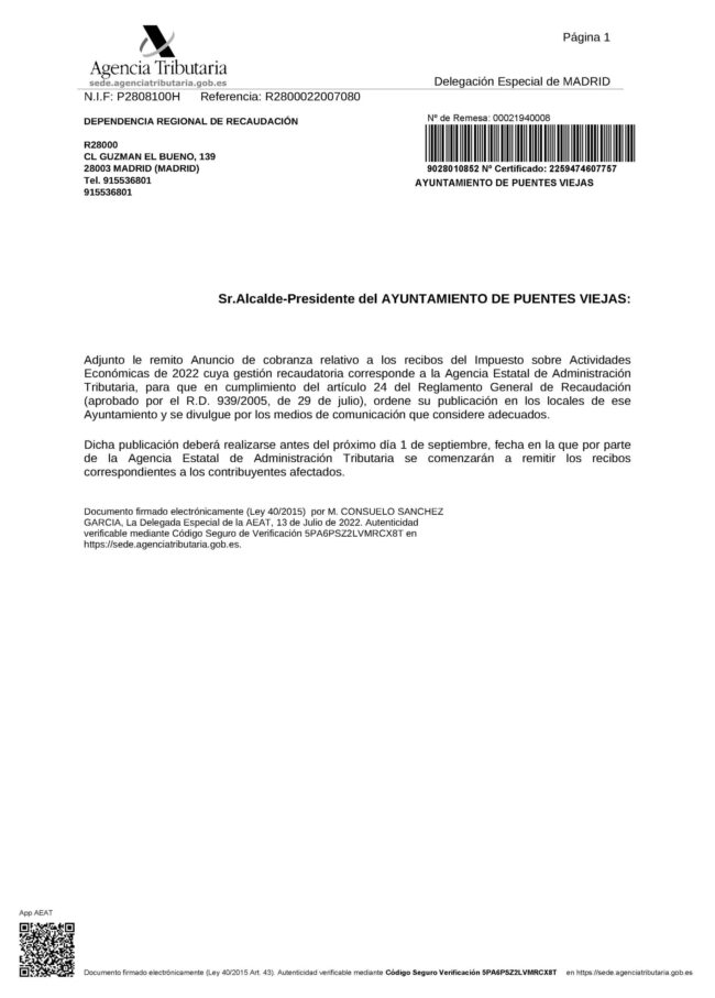Anuncio de cobranza relativo a los recibos del Impuesto sobre Actividades Económicas de 2022 cuya gestión recaudatoria corresponde a la Agencia Estatal de Administración Tributaria, para que en cumplimiento del artículo 24 del Reglamento General de Recaudación (aprobado por el R.D. 939/2005, de 29 de julio),
