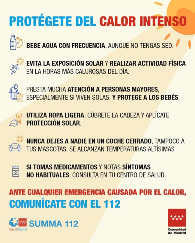 Ante el calor intenso, sigue estas recomendaciones y disfruta del verano en nuestra región. Frente a una emergencia, contacta con la Agencia de Seguridad y Emergencias Madrid 112.