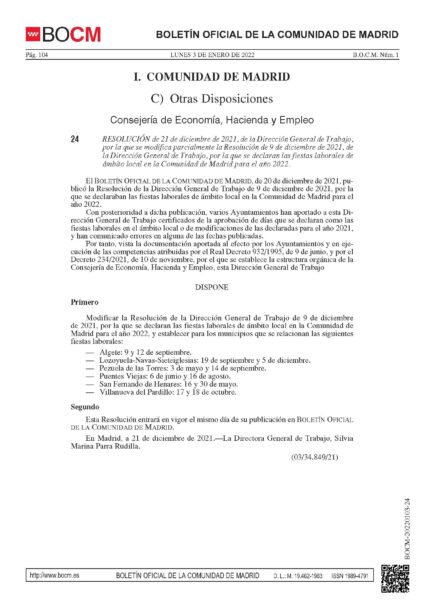 — Algete: 9 y 12 de septiembre.— Lozoyuela-Navas-Sieteiglesias: 19 de septiembre y 5 de diciembre.— Pezuela de las Torres: 3 de mayo y 14 de septiembre.— Puentes Viejas: 6 de junio y 16 de agosto.— San Fernando de Henares: 16 y 30 de mayo.— Villanueva del Pardillo: 17 y 18 de octubre.