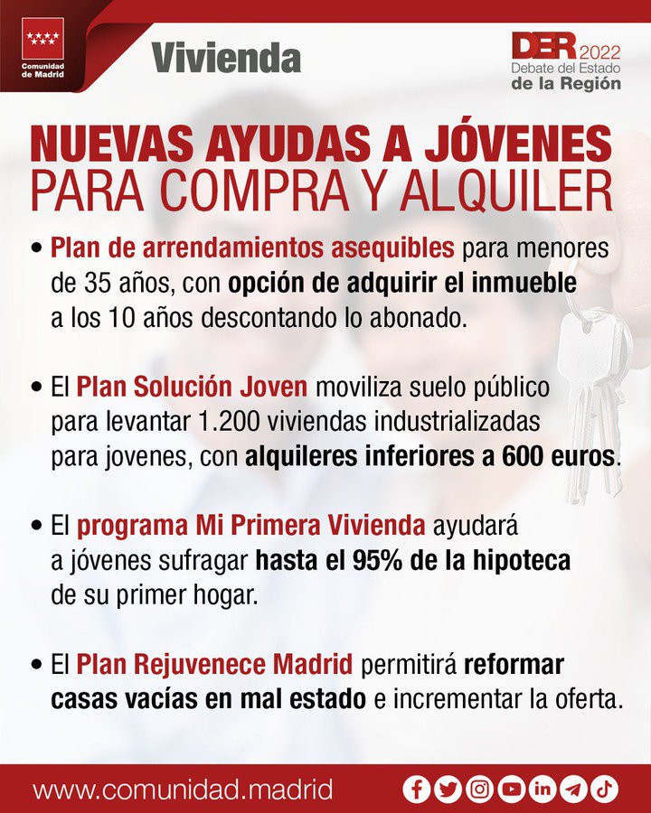 Es una prioridad para el Ejecutivo regional. La Comunidad de Madrid ha impulsado el Plan de Alquiler con opción a compra, el Plan Solución Joven y el programa Mi Primera Vivienda.