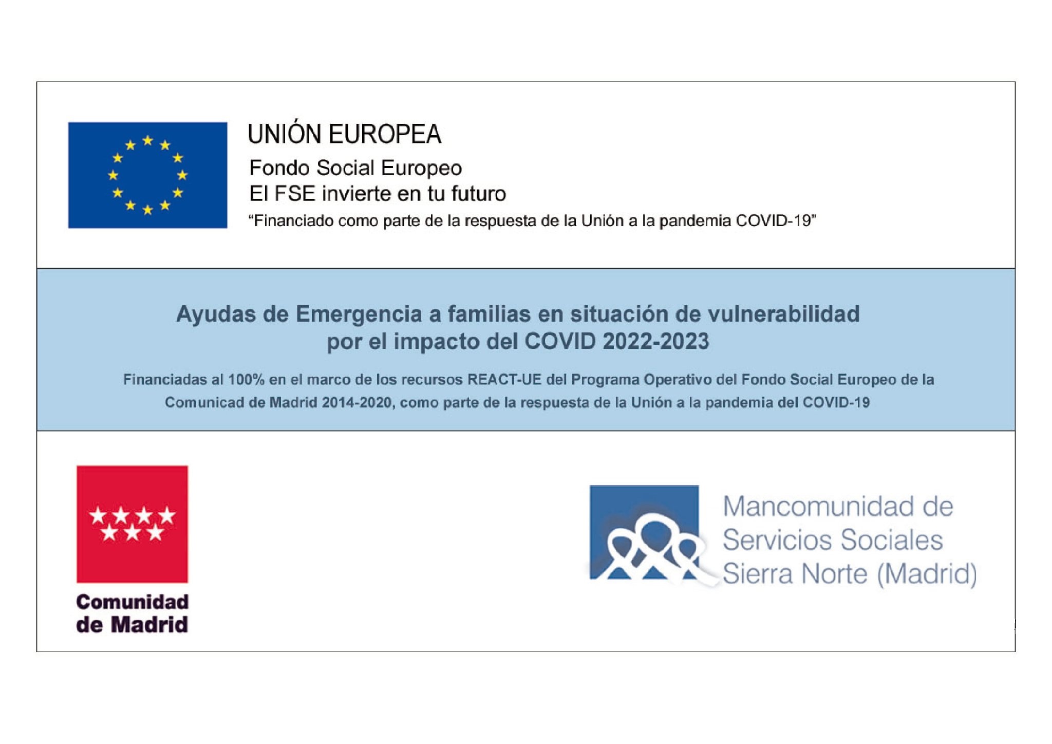 DetallesAyudas de Emergencia a Familias en situación de vulnerabilidad por el impacto del COVID 2022-2023. Destinadas a cubrir las necesidades básicas de las personas empadronadas en cualquier municipio de la Mancomunidad, y que se encuentren en situación de emergencia social debido a la crisis económica y derivadas de la pandemia. Más información: http://www.mancomunidadsierranorte.org/ Solicitudes a través…