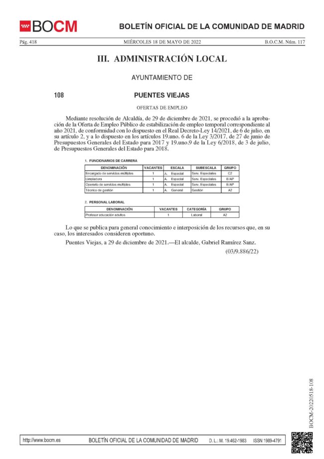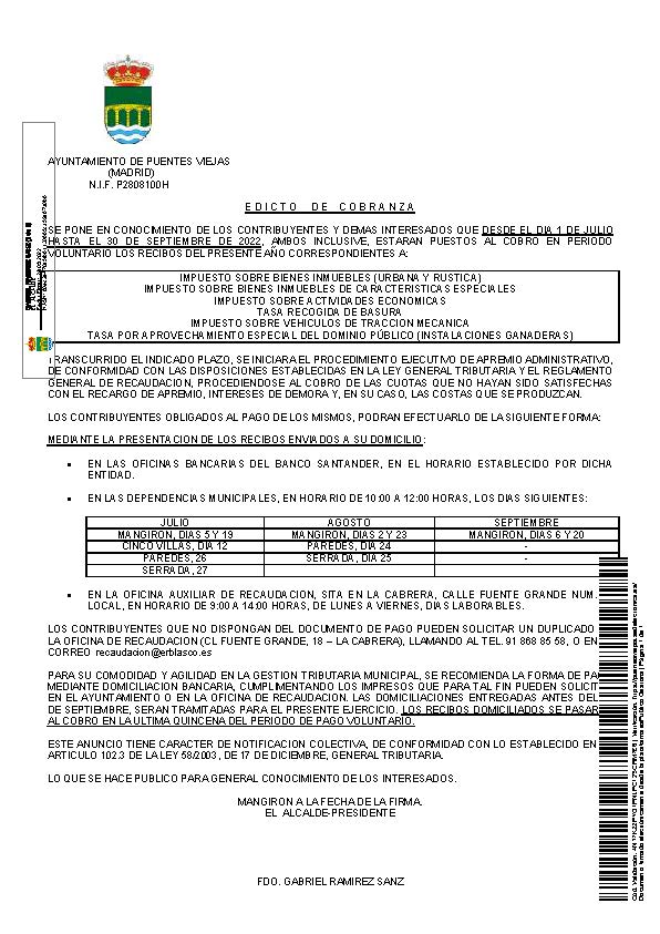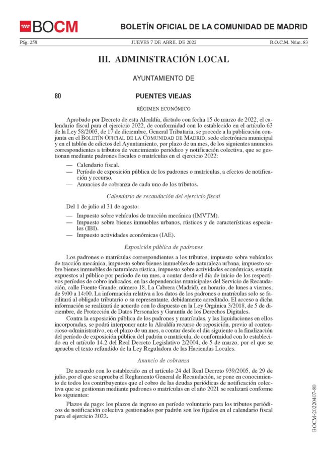 Aprobado por Decreto de esta Alcaldía, dictado con fecha 15 de marzo de 2022, el calendario fiscal para el ejercicio 2022, de conformidad con lo establecido en el artículo 63 de la Ley 58/2003, de 17 de diciembre, General Tributaria, se procede a la publicación conjunta en el BOLETÍN OFICIAL DE LA COMUNIDAD DE MADRID, sede electrónica municipal y…