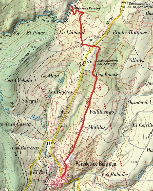 La ruta parte de la Plaza de Paredes donde se encuentra la Iglesia de la Inmaculada Concepción y el Centro de Interpretación dedicado al Frente del Agua. Justo al lado de la parada de autobuses, hay un cartel informativo de la Red de Caminos de Carpetania donde se indica la dirección de la ruta hacia el molino de la Nava, que comparte una parte de su trazado con la del Camino de los Descansaderos y la del Frente del Agua. Tomaremos la calle de la Fuente, y tras pasar por una fuente al lado del consultorio local, llegaremos al potro de herrar, el pequeño museo de la Fragua y la Fuente Vieja, al lado de las pistas deportivas de la localidad. Desde este punto continuamos por el Camino de los Linares (izquierda), un bonito sendero tradicional que transcurre entre cercados de piedra, fresnos, robles, matorrales espinosos y prados, que nos deja ver en el firme de su trazado el empedrado antiguo. Giraremos hacia la derecha, y tras pasar el panel interpretativo del Camino de los Descansaderos, nos encaminamos hacia la carretera M-127, que cruzaremos con precaución para encaminarnos hacia el camino del molino dejando atrás las posiciones de Peñas Bajas 1 y 4 de la Ruta del Frente del Agua.
